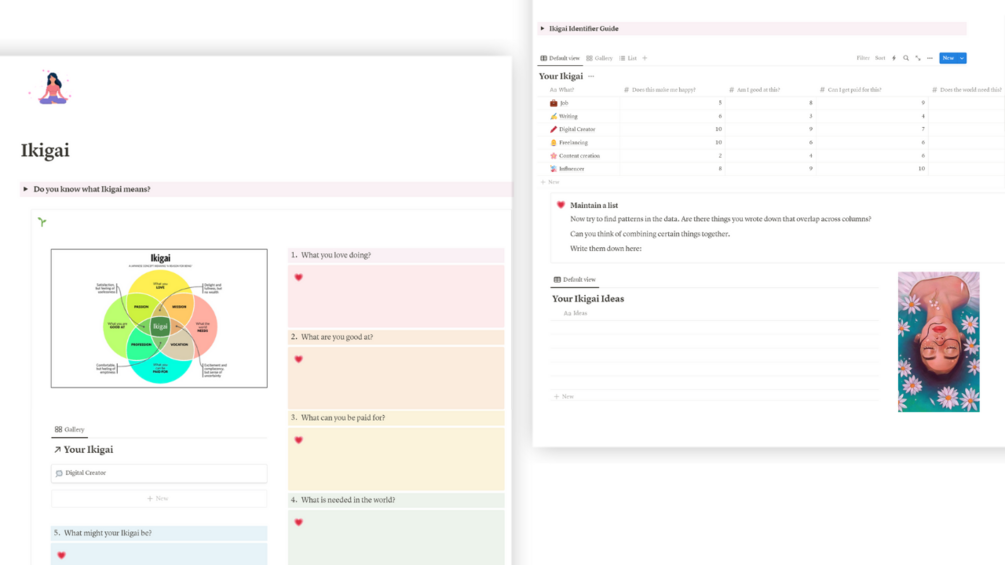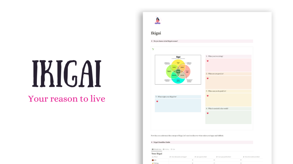 Introducing an Ikigai Guide Notion Template – think of it as your treasure map to discover your life's purpose. It kickstarts a thoughtful reflection process and helps you test your ideas.